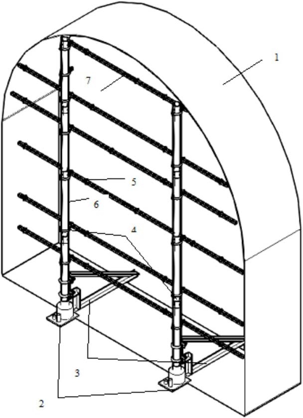 1.一种用于隧道通风风速或风量测试时的风杯安装支架,其特征在于,包括测试断面所在风道壁(1),测试断面所在风道壁(1)的底部并列固定有若干直角三角形底座(3),直角三角形底座(3)的一边上固定有圆形竖杆(6),圆形竖杆(6)的底部设置有千斤顶(2),圆形竖杆(6)上通过横杆卡扣(4)连接有若干能够沿圆形竖杆(6)上下移动的方形横杆(7),且方形横杆(7)与圆形竖杆(6)垂直设置,方形横杆(7)上设有若干用于安装风杯且能够沿方形横杆(7)左右移动的风杯基座(5);
