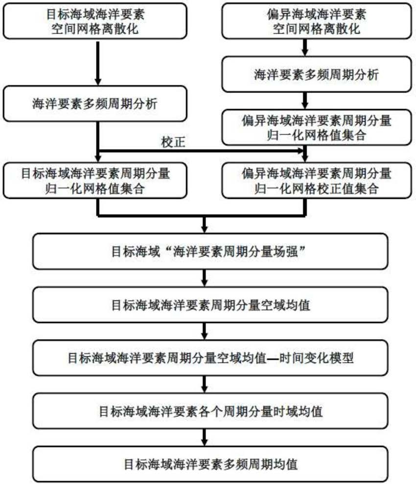 对于仅与目标海域部分重合的偏异海域,其调查资料与目标海域存在时空偏异,需要校正;首先在目标海域选择海洋要素标准基准点,将目标海域海洋要素周期分量网格化数值都除以标准基准点的数值,见式1,得到海洋要素周期分量的归一化网格值:其中, 为目标海域海洋要素周期分量归一化网格值集合, 为目标海域海洋要素周期分量网格值集合, 为海洋要素周期分量标准基准点数值;