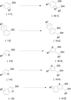2)、(III-3)、(III-4)、(III-5)或(III-6)所示的取代芳基甲醇类化合物;所述的路易斯酸为下列之一:氯化锌、溴化锌、三氯化铝、三溴化铝;所述有机溶剂为下列之一:苯、甲苯、二甲苯、二氯甲烷、二氯乙烷、氯仿、乙酸乙酯、四氢呋喃;