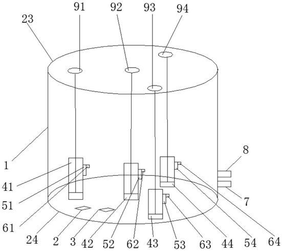 1.一种恒力输出执行器,其特征在于:包括圆筒状的柱体和至少四个自动调整气缸,所述柱体包括顶盖、底盖和柱身,所述底盖与柱身固定相连,所述顶盖为活动盖;所述每一个自动调整气缸的缸体均与底盖固定相连,每一个自动调整气缸顶部可自由伸缩的推杆均与顶盖活接固定相连,其中一个自动调整气缸设于底盖中心处,其他自动调整气缸以底盖中心处为中心对称分布;所述自动调整气缸包括供气管道、第一电磁阀、第二电磁阀、第一气缸、第二气缸、以及第三气缸,所述第一气缸设于第二气缸上方,第一气缸内设有两个活塞,其中上部活塞设有能够伸出第一气缸顶部的推杆,下部活塞与第二气缸内的活塞通过刚性连杆固定相连,第三气缸的顶部与第一气缸下部侧面通过连通管道相连,第一气缸的两个活塞之间部分以及第三气缸的活塞以上部分均充满液压油,第一气缸顶部和第三气缸底部分别设有气口一和气口四,第二气缸顶部和底部分别设有气口二和气口三,所述气口一和气口四通过供气管道与第一电磁阀输出管道相连,第一电磁阀输入端通过进气管道连接气源或排大气,所述气口二和气口三通过供气管道与第二电磁阀输出管道相连,第二电磁阀输入端通过进气管道与气源相连或者排大气。