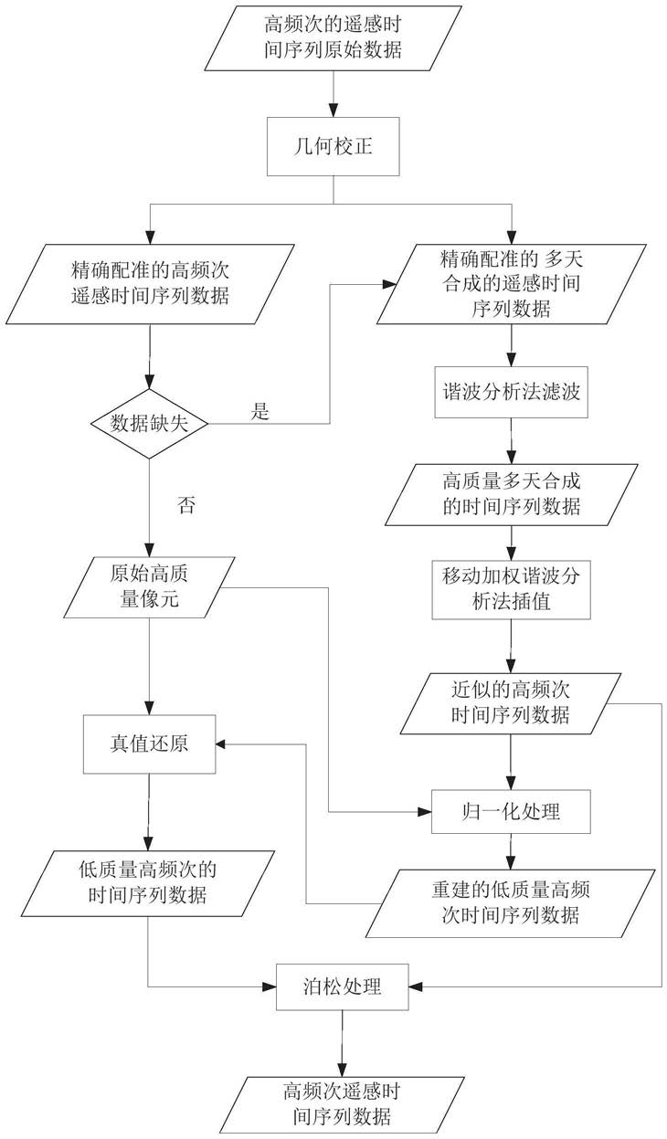 步骤2,对步骤1生成的高质量的多天合成的时间序列数据进行时域插值重建,得到与目标数据时间分辨率一致的高频次遥感时间序列数据;步骤2中对步骤1生成的高质量的多天合成的时间序列数据进行时域插值重建,得到与目标数据时间分辨率一致的高频次遥感时间序列数据;