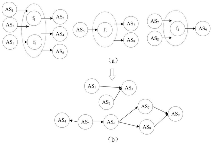 步骤2.3.1:将现有的服务关系存储至服务组合日志库L中,L={N,R},其中N为各局部社交服务网节点的集合,R为各局部社交服务网社交关系的集合,即对任一局部社交服务网,其节点集合Nk={AS1,AS2,…ASi}和社交关系集合Rk={ASm,ASn∈Nk|
