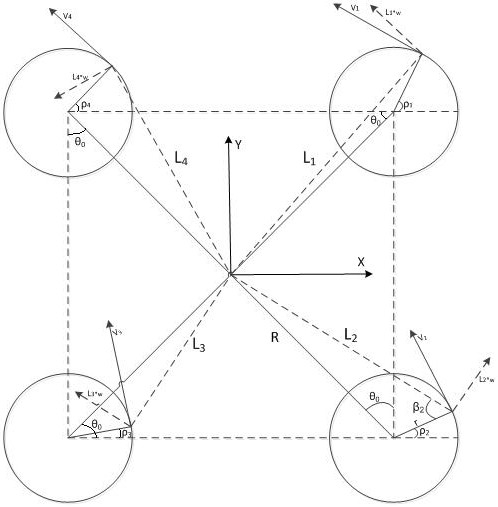 x--移动舞台在世界坐标系X轴的坐标值,y--移动舞台在世界坐标系Y轴的坐标值,θ--移动舞台在世界坐标系中的旋转角,θ0--车体对角边和侧边的夹角,对于结构固定的车体,θ0为某一定值,R--车体质心到转向结构旋转中心的距离,r--转向结构的旋转半径,