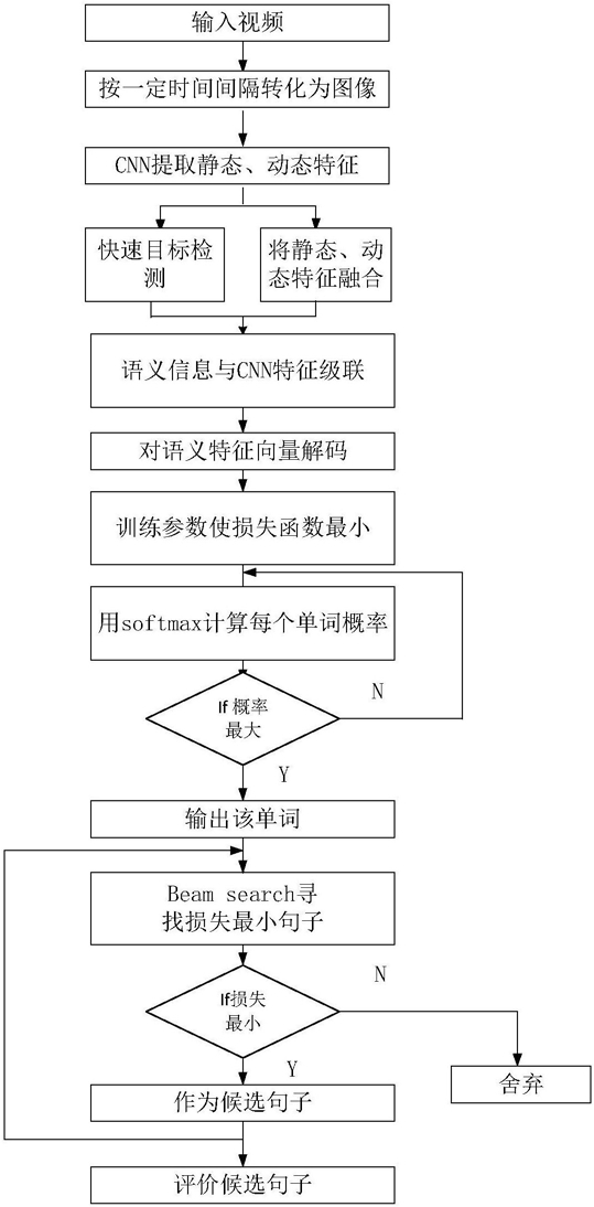 6.根据权利要求5所述的一种基于语义信息引导的视频内容描述方法,其特征在于步骤(5)所述的对视频描述模型进行测试,具体如下:测试阶段,因为描述句子的内容和长度是未知的训练后的视频内容描述模型运用beam search的方法,设定搜索范围k,在第一个时间节点设定初始单词索引-1输入到第一个时间节点,即将零向量输入到第一个时间节点;计算出当前状态h0,并根据h0和softmax函数算出当前节点可能产生的k个单词索引,并将该k个单词继续加入到下一个时间节点中,计算下一个时间节点可能产生的k个单词并和上一节点的对应单词组成序列;在大小为V的候选单词中每个单词的概率计算公式如式(13)所示:其中,ht代表当前节点的隐藏状态,yt-1代表前一个时间节点由beamsearch搜索到的概率最大单词。
