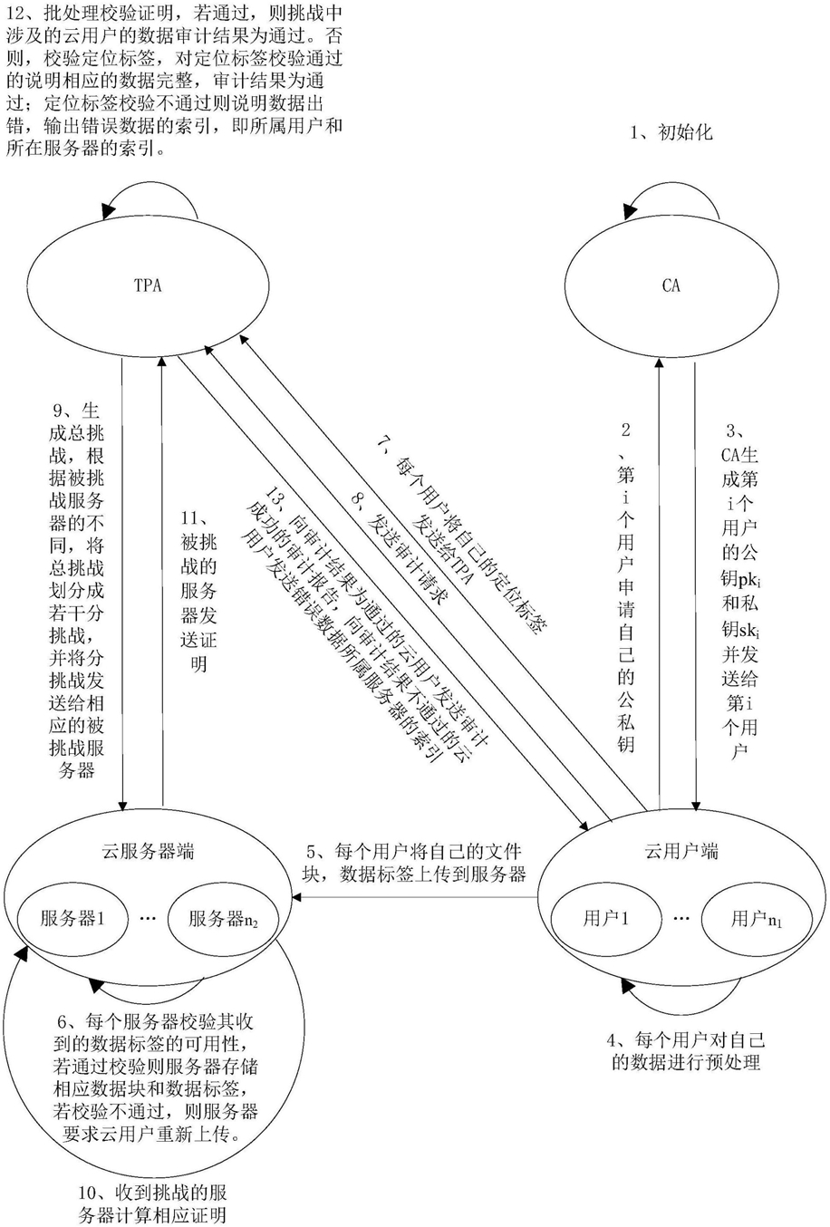 5)TPA接收到所述审计请求后,对多个云服务器上多个云用户的数据进行挑战,收到被挑战的云服务器返回的证明后,TPA校验所述证明的正确性,若通过校验,则TPA给所有云用户发送校验成功信息;否则TPA校验定位标签,将错误数据的索引返回给相应云用户。