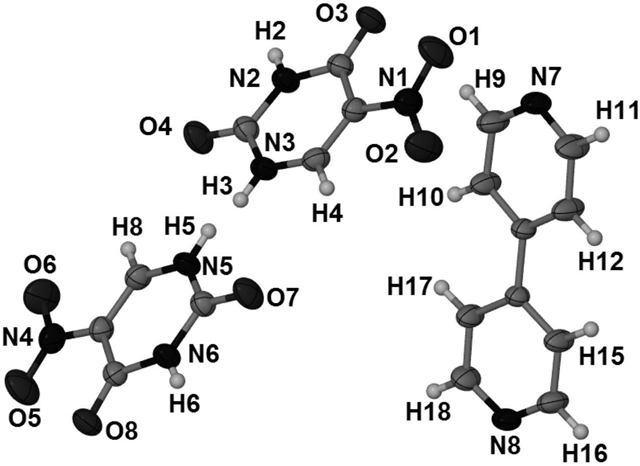 所述超分子共晶是由5-硝基尿嘧啶和4,4’-二联吡啶组成的一种超分子共晶化合物,具有确定空间结构,其分子式为C18H14N8O8,结构单元为[(C10H8N2)(C4H3N3O4)2],晶系为三斜晶系,空间群为P-1,晶胞参数为 α=97.373°,β=