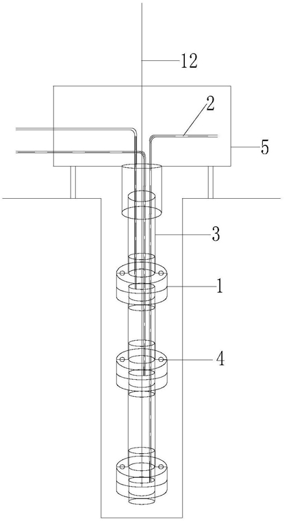 a. 在被测区域地面向采动覆岩垂直钻孔直至采场上方直接顶埋深所在位置,利用吊绳(12)将多测点监测装置放入钻孔,随着下放过程将内通钢丝绳的PVC管(2)固定在上下两个套管(3)的活动卡盘(1)之间,直至采场顶板覆岩主,亚关键层所在位置;