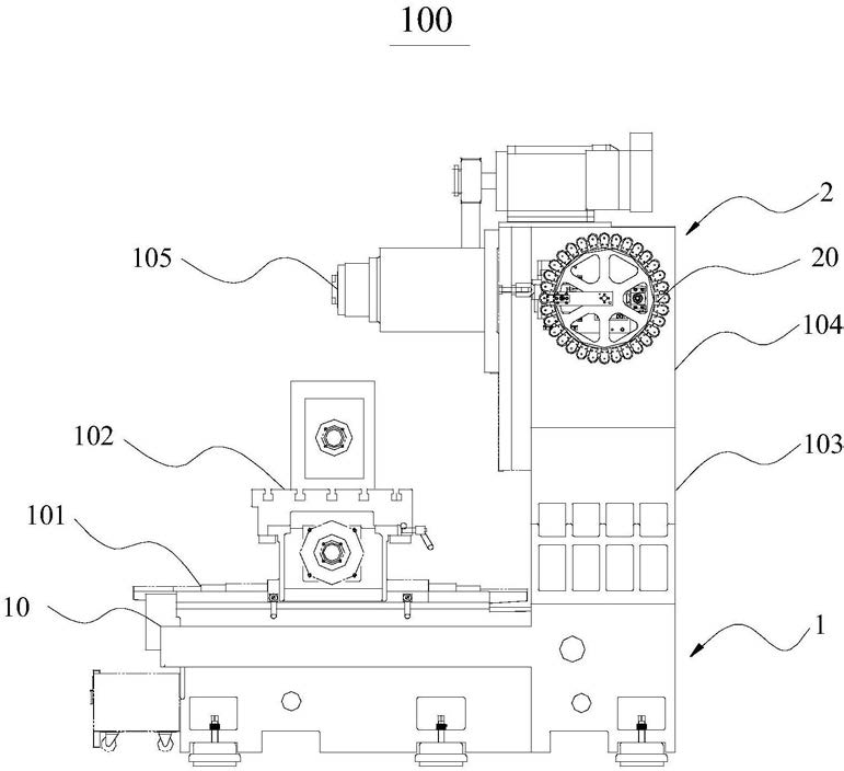 包括机座、主轴箱与自动换刀装置;所述机座包括具有支承面的座体、设于所述支承面上的回转台与垂直连接于所述支承面的立柱;所述主轴箱设于所述立柱;所述支承面上设有沿第一方向延伸的第一驱动机构,以及沿第二方向延伸的第二驱动机构;所述回转台与所述第一驱动机构和所述第二驱动机构传动配合;