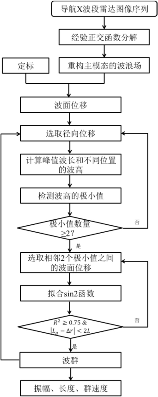 根据方程(4)可得波群的长度为: 最大振幅近似为:根据相邻时间内波群位置的变化,得到波群的群速度为: 其中Δt是相邻两个雷达图像序列的时间间隔,ΔR是这段时间内该波群移动的距离。