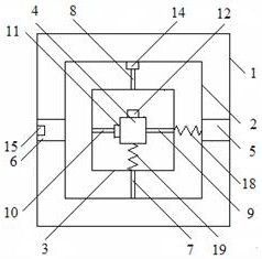 1.一种多方向压电振动发电机,包括用于支撑和安装的外层框架(1)、中层框架(2)、内层框架(3)、中心质量块(4)、压电梁一(5)、压电梁二(6)、压电梁三(7)、压电梁四(8)、压电梁五(9)、压电梁六(10)、永磁体一(11)、永磁体二(12)、永磁体三(13)、永磁体四(14)、永磁体五(15)、永磁体六(16)、限位弹簧一(17)、限位弹簧二(18)和限位弹簧三(19),其特征在于:所述外层框架(1)、中层框架(2)和内层框架(3)相互嵌套,所述中心质量块(4)位于框架的几何中心位置,并通过压电梁五(9)、压电梁六(10)、限位弹簧三(19)与内层框架(3)相连,所述内层框架(3)通过压电梁三(7)、压电梁四(8)、限位弹簧二(18)与中层框架(2)相连,所述中层框架(2)通过压电梁一(5)、压电梁二(6)、限位弹簧一(17)与外层框架(1)相连,所述永磁体一(11)和永磁体二(12)固定在中心质量块(4)上,所述永磁体三(13)固定在内层框架(3)上,所述永磁体四(14)固定在中层框架(2)上,所述永磁体五(15)和永磁体六(16)固定在外层框架(1)上。