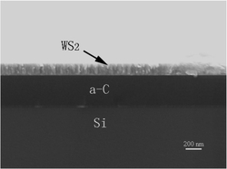 (3)WS2薄膜的制备:将步骤(2)所得非晶态碳膜的温度调整到200℃,然后以WS2靶为溅射靶材,控制溅射功率为60W,溅射气压为0.6Pa,溅射时间为9min~46min,在非晶态碳膜上沉积厚度为140nm~740nm的WS2薄膜,从而获得二硫化钨薄膜。