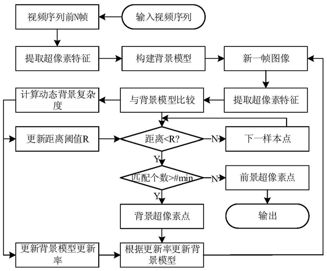步骤S3,提取新的一帧图像,利用SLIC0分割法对图像进行超像素分割,计算其每个初始种子点上的超像素块与该种子点上超像素块的样本模型中每个样本之间的欧氏距离,若某超像素块与样本之间欧式距离小于距离阈值R的总数小于匹配阈值,则判断该超像素块为前景块;此帧图像中所有的前景超像素块便组成了运动目标检测结果。