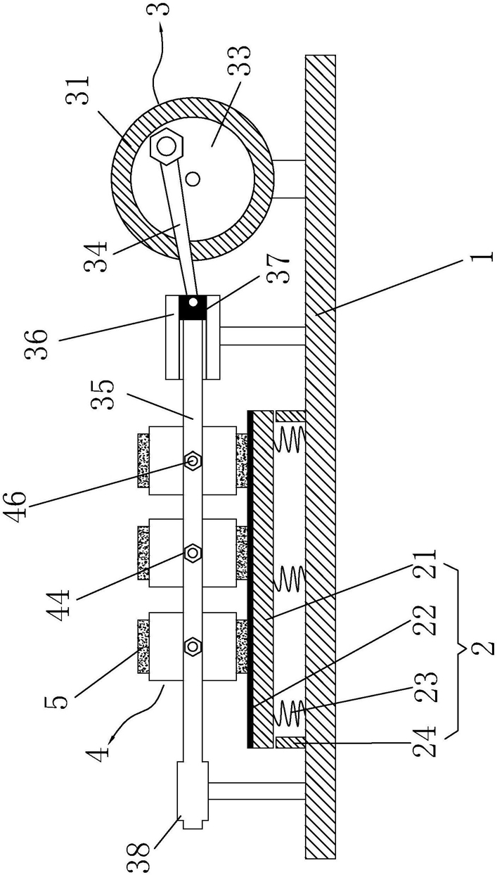 动作机构,设于底座上,所述动作机构包括驱动件、转动件、连杆、导杆以及导轨,连杆连接于转动件和导杆之间,驱动件驱动转动件转动,并通过连杆带动导杆于工作台上方沿导轨作直线往复运动;所述驱动件包括电机和连接电机的变频器,所述转动件是轮盘,电机带动轮盘转动并通过变频器进行转速调节;所述动作机构还包括连接件,所述连接件固定于所述导杆的末端并滑动配合于所述导轨内;所述连杆的末端设有圆轴,所述连接件设有与圆轴适配的凹槽,所述连接件和连杆通过圆轴与凹槽配合连接;