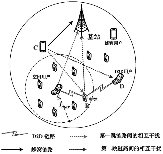 2.根据权利要求1所述的D2D中继网络中基于社会特性的中继选择方法,其特征在于,第一跳通信中,D2D用户发送端s通过D2D链路向中继发送信号,D2D链路受到蜂窝链路的干扰,则D2D用户发送端s与中继之间链路的信号传输模型为:其中,Ps为D2D用户发送端s的发送功率,Pc为蜂窝用户的发送功率,n为加性高斯白噪声,加性高斯白噪声的功率谱密度为n0,di,j为节点i与节点j之间的距离,α为路径损耗指数,则D2D用户发送端s与中继之间链路的信干噪比γs,r及第一跳通信时蜂窝链路的信干噪比γC,1分别为:第二跳通信中,中继向D2D用户接收端d发送信号,则中继与D2D用户接收端d之间链路的信干噪比γr,d及第二跳通信时蜂窝链路的信干噪比γC,2分别为:。