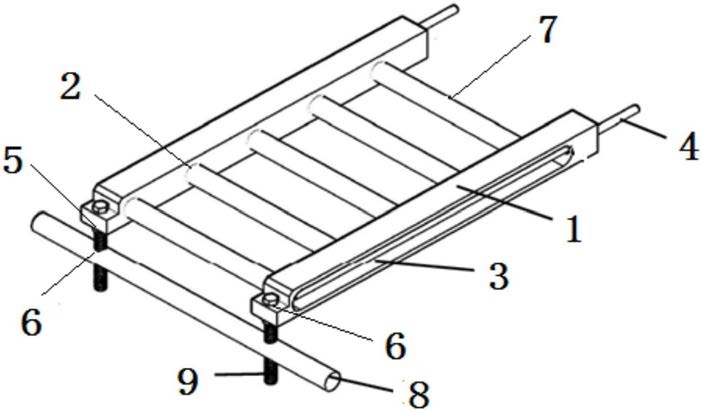 1.一种钢筋锈蚀光纤传感监测装置,其特征在于主体结构包括连接件、连接孔、U形槽、电缆管、连接台、螺栓孔、阶段元、固定棒和螺栓;矩形结构的连接件的内侧面等间距开设5个连接孔,连接件的外侧面开设U形槽,连接件的一端设置有电缆管,连接孔和电缆管分别与U形槽连通,连接件的另一端设置有连接台,连接台开设有贯穿连接台的螺栓孔,5根圆柱形结构的阶段元的两端分别插入2根连接件的连接孔中,连接孔的直径比阶段元的外壁直径大1mm,以使阶段元与连接件紧密接触并固定连接,阶段元伸入连接孔的水平距离为3‑