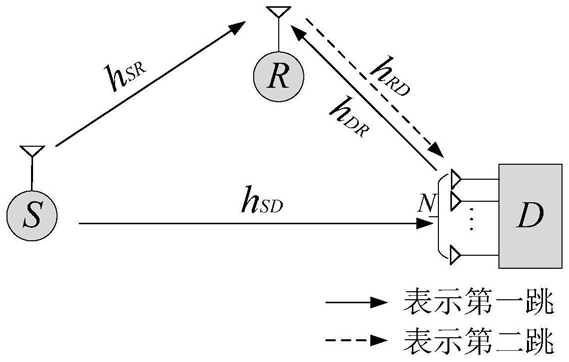 1.一种基于最优天线选择的全双工多天线目的节点干扰传输方法,应用在包括信源S、中继R和目的端D三个节点的无线通信系统中,所述中继为非可信中继;其特征在于,所述目的节点配置N根天线且工作于全双工模式下,且目的节点的收发天线随机分配,其余节点配置单根天线,所述无线通信系统信息的传输过程分为两个时隙完成,所述全双工多天线目的节点干扰传输方法包括:目的端获知信源端和中继端发送的导频信息,根据导频信息估计信道,获取信道状态信息;
