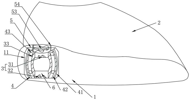 6.根据权利要求5所述的磁力减震鞋,其特征在于:所述挤压块(5)上开设有若干个细小的通气孔(54),所述通气孔(54)连通空槽(11)和鞋底(1)外部,当鞋跟部受力时,所述挤压块(5)和第一磁块(31)被压向第二磁块(32),所述空槽(11)内的空气通过通气孔(54)排出到鞋底(1)外部。