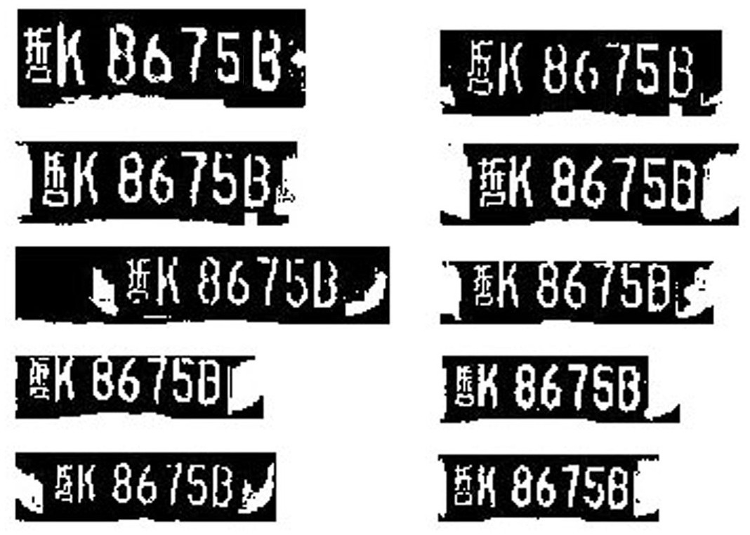 2.如权利要求1所述的基于统计的车牌识别方法,其特征在于:所述步骤1中具体图像获取步骤为:当车辆完全进入给定监控区域后,置i=0,A=1,保留第一帧视频图像为pi,置ni=1,将(pi,ni)加入集合N中;对于之后的每帧图像,需要先分析图像中该车辆与前一帧相比是否发生了位移,如果发生位移,则i=i+1并保留该帧图像为pi,置ni=1,A=A+1,并将(pi,ni)加入集合N中,否则,将集合中(pi,ni)的ni更新为ni=ni+1,pi保持不变;当满足以下两个条件之一时,完成图像获取:(1) (2)车辆完全消失在给定监控区域之外;其中,L是事先设定的最大分析帧数;