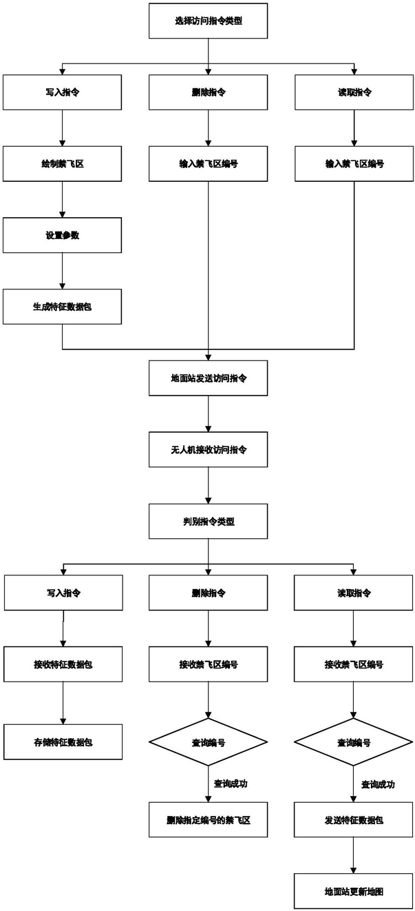 7.根据权利要求1所述的一种无人机飞行区域的控制方法,其特征在于:所述步骤S04中,运行删除指令步骤包括接收禁飞区编号,查询禁飞区编号和发送特征数据包到地面站,地面站更新地图信息。