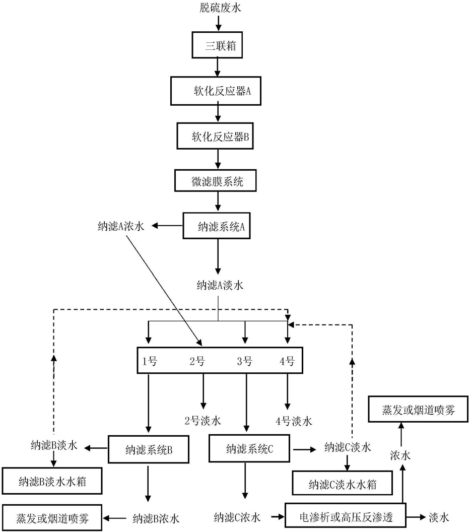 9.根据权利要求1所述的处理方法,其特征在于,经过离子重组后的2号流道和4号流道分流至对应的产水水箱中获得的淡水回用至脱硫塔或循环冷却塔。