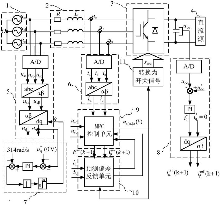 步骤三、采样直流侧电容电压udc,通过定直流电压外环控制单元(8)得到并网电流d轴分量的给定值 并且把并网电流q轴分量的给定值 设为0,将他们反变换到两相静止坐标系下得到k+1时刻的并网电流给定值步骤四、将步骤三得到的k+1时刻并网电流给定值 由步骤一得到的k时刻并网电流值iα,β(k)送给电流内环MPC控制单元(9),从而获得逆变器在k时刻的输出电压矢量uc(α,β)(k)以及k+1时刻的并网电流预测值步骤五、将步骤四得到的并网电流预测值 和输出电压矢量uc(α,β)(k)以及步骤一得到的并网电流值iα,β(k),送到预测偏差反馈单元(10),得到k+1时刻的电流预测偏差△α,β(k+1),并将k+1时刻的预测偏差代入到步骤四的电流内环MPC控制单元(9)中,对步骤四中的电流内环MPC控制单元(9)进行修正;