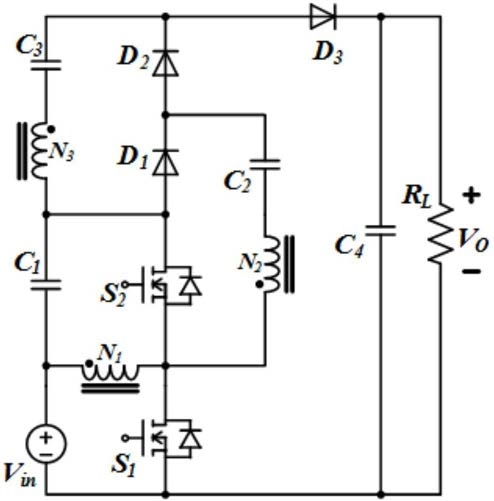 1.一种基于耦合电感的高增益PWM直流升压变换器,其特征在于,包括:一个直流电压源;第一开关管和第二开关管,所述第一开关管的源极与所述直流电压源的负极连接;所述第二开关管的源极与所述第一开关管的漏极连接;第一二极管,所述第一二极管的阳极与所述第二开关管的漏极连接;第二二极管,所述第二二极管的阳极与所述第一二极管的阴极连接;第三二极管,所述第三二极管的阳极与所述第二二极管的阴极连接;一个耦合电感器,所述耦合电感器包括第一线圈、第二线圈和第三线圈;所述耦合电感器中第一线圈的同名端与所述直流电压源的正极连接,异名端同时与所述第一开关管的漏极和所述第二开关管的源极连接;所述耦合电感器中第二线圈的同名端同时与所述第一开关管的漏极和所述第二开关管的源极连接;第一电容器,所述第一电容器的一端同时与所述耦合电感器中第一线圈的同名端和所述直流电压源的正极连接,另一端同时与所述第一二极管的阳极、所述第二开关管的漏极、以及所述耦合电感器中第三线圈的异名端连接;第二电容器,所述第二电容器的一端与所述耦合电感器中第二线圈的异名端连接,另一端同时与所述第二二极管的阳极和所述第一二极管的阴极连接;第三电容器,所述第三电容器的一端与所述耦合电感器中第三线圈的同名端连接,另一端同时与所述第三二极管的阳极和所述第二二极管的阴极连接;第四电容器,所述第四电容器的一端与所述第三二极管的阴极连接,另一端同时与所述第一开关管的源极和所述直流电压源的负极连接;一个负载,所述负载与所述第四电容器并联。2.根据权利要求1所述的一种基于耦合电感的高增益PWM直流升压变换器,其特征在于,所述第二开关管替换为第四二极管;所述第二开关管的源极与所述第一开关管的漏极连接替换为所述第四二极管的阳极与所述第一开关管的漏极连接;所述第一二极管的阳极与所述第二开关管的漏极连接替换为所述第一二极管的阳极与所述第四二极管的阴极连接。3.根据权利要求1至2任意一项所述的一种基于耦合电感的高增益PWM直流升压变换器,其特征在于,所述第二电容器与所述耦合电感器中第二线圈的位置交换,所述第二电容器的连接关系和所述耦合电感器中第二线圈的连接关系替换为:所述耦合电感器中第二线圈的异名端同时与所述第一二极管的阴极和第二二极管的阳极连接,所述第二线圈的同名端与所述第二电容器的一端连接;所述第二电容器的另一端与第一开关管的漏极连接。4.根据权利要求1所述的一种基于耦合电感的高增益PWM直流升压变换器,其特征在于,所述第三电容器与所述耦合电感器中第三线圈的位置交换,所述第三电容器的连接关系和所述耦合电感器中第三线圈的连接关系替换为:所述耦合电感器中第三线圈的同名端同时与所述第二二极管的阴极和第三二极管的阳极连接,所述第三线圈的异名端与所述第三电容器的一端连接;所述第三电容器的另一端与第一二极管的阳极连接。