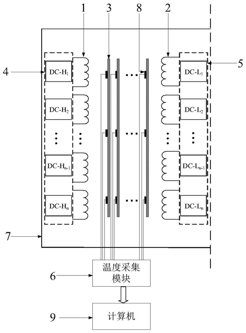 1.一种实际负载损耗下变压器绕组主绝缘温度梯度的测试系统,用于研究变压器绕组主绝缘在实际运行负载下的温度梯度分布,其特征在于,主要由高压绕组(1)、低压绕组(2)、绕组主绝缘(3)、高压侧直流电源模块(4)、低压侧直流电源模块(5)、温度采集模块(6)、实验箱(7)、温度传感器(8)以及计算机(9)组成,其中:高压绕组(1)、低压绕组(2)、绕组主绝缘(3)以及温度传感器(8)设置在实验箱(7)内部;高压绕组(1)、绕组主绝缘(3)和低压绕组(2)由外向内呈同心圆柱面分布;