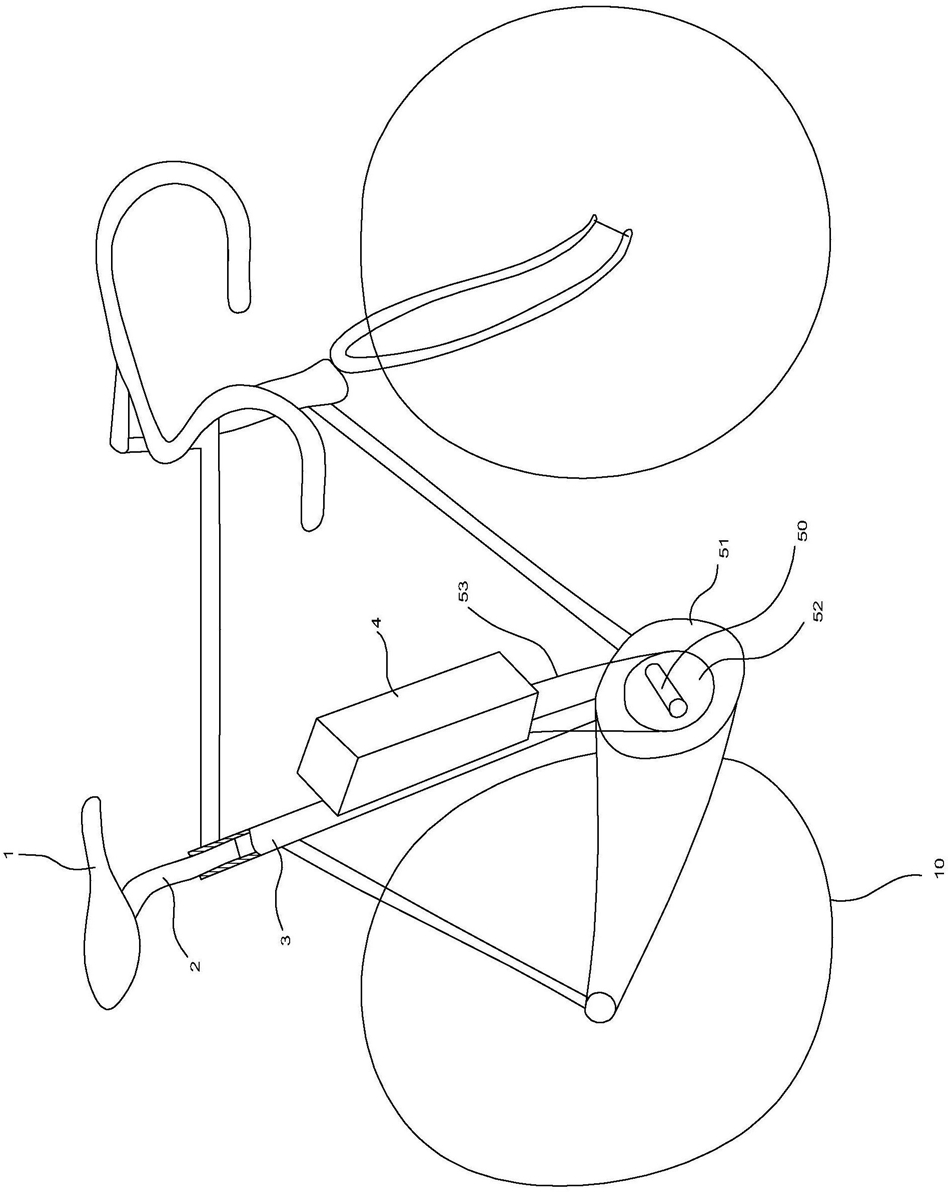 1.一种防疲劳自行车,包括座垫(1)、座杆(2)、立管(3)和转轴(50),座垫(1)固定于座杆(2)之上,座杆(2)滑动设置于立管(3)之上,转轴(50)两端与脚踏板相连,转轴(50)的一侧靠近其中一个踏板处设置有一传动链轮(51),其特征在于:所述转轴(50)的另外一侧靠近另外一个踏板处设置有驱动链轮(52),所述立管(3)上设置有一调节箱(4),调节箱(4)内设置有第一转轴(81)和第二转轴(82),第一转轴(81)上设置有从动链轮(54)以及由该从动链轮(54)带动的第一齿轮(61),驱动链轮(52)和从动链轮(54)通过链条(53)连接,第二转轴(82)上设置有与第一齿轮(61)啮合的第二齿轮(62),第一齿轮(61)一侧端面设置有与第一转轴(81)轴线偏心的偏心轮(611),第二齿轮(62)一侧端面上开设有与第二转轴(82)轴线偏心的环槽(621),第一齿轮(61)上设置有第一连杆(71),第二齿轮(62)上设置有第三连杆(73),在第一连杆(71)和第三连杆(73)之间设置有第二连杆(72),第一连杆(71)的一端形成有与偏心轮(611)相适配的安装孔,第一齿轮(61)上的偏心轮(611)插装于安装孔内,第一连杆(71)的另一端与第二连杆(72)的一端铰接,第二连杆(72)的另一端与第三连杆(73)的一端铰接,第三连杆(73)的中部形成有一插销部(731),插销部(731)适配于第二齿轮(62)的环槽(621)内,第三连杆(73)的另一端开设有一条形孔(732),该条形孔(732)内滑动设置有一滑块(74),所述座杆(2)上设置有一传动销(21),该传动销(21)插装于滑块(74)之上带动座杆(2)在立管(3)内上下滑动。