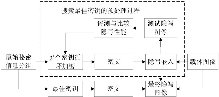 2.根据权利要求1所述的基于搜索最佳密钥的数字图像隐写方法,其特征在于:所述步骤(4)中原始秘密信息的最佳密钥通过如下方式获得:步骤(4-1)、设置三个参数:测试密钥的编号j,最佳隐写性能指标ξ最佳和取得最佳隐写性能参数对应密钥的编号J最佳;将j和J最佳的初始值均设为1,最佳隐写性能参数ξ最佳的值根据测试隐写性能指标需要预先设定;