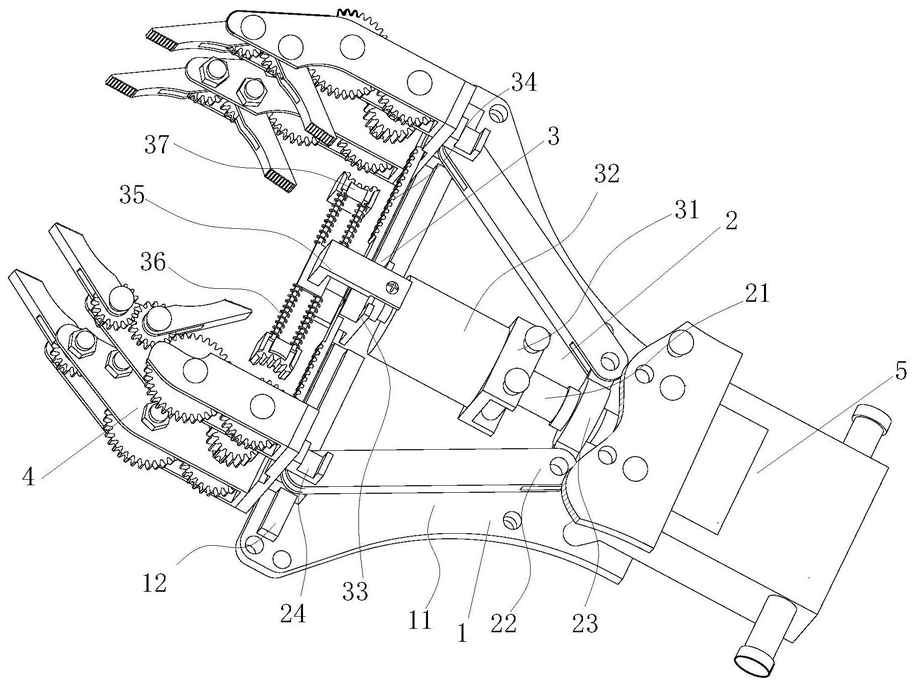 所述的夹持体一与夹持体二安装在连接螺杆的两端;所述的夹持体一与夹持体二的结构相同,其包括夹持体安装架、齿轮二、齿轮三、下夹持指、齿轮四、扭力弹簧、上夹持指,所述的齿轮二位于夹持体安装架的内部,通过键连接在连接螺杆上,所述的齿轮三通过螺栓连接在夹持体安装架上,所述的齿轮四为两个,分别与上夹持指和下夹持指固连在一起,所述的上夹持指通过螺栓连接在夹持体安装架上,所述的下夹持指通过螺栓连接在夹持体安装架上,所述的扭力弹簧的两端分别固连在上夹持指和下夹持指上。