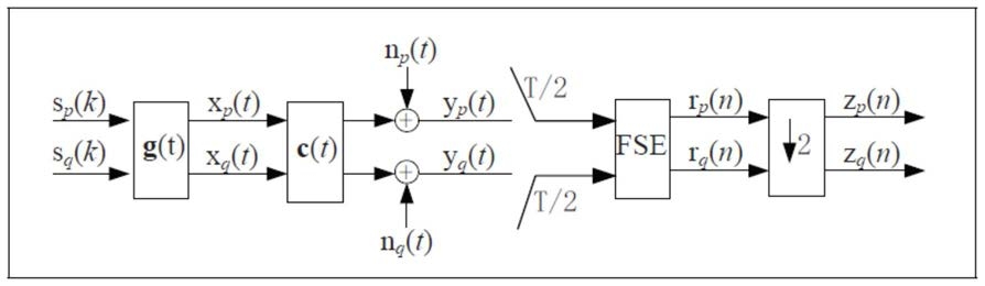 其中:L是分数间隔均衡器FSE的长度;Wp,q是X轴方向偏振p和Y轴方向偏振q之间的FSE,Wp,p(i)是Wp,q的第i个抽头系数;在FSE输出样本中进行2倍抽取,创建Ts-间隔输出序列,输出序列矩阵为:z(n*)=wTyL(n*);其中:z(n*)=[zp(n*),zq(n*)]T;yL(n*)=[y(n*)T,y(n*-1)T,...y(n*-L+1)T]T是离散时间矩阵信号,y(n*)是y(t)的离散时间信号表达式,n*是大于等于零的整数;w=[w0,w1,...wL-1]T是均衡器向量,w0,w1,...wL-1为该均衡器向量的元素,即抽头系数;zp(n*),zq(n*)分别表示X轴方向偏振p和Y轴方向偏振q上的Ts-间隔输出序列;4)将高斯白噪声等效为v(n*),则X轴方向偏振p上的Ts-间隔输出序列z(n*)表示为:z(n*)=s(n*-d)+v(n*),s(n*-d)表示延迟了d个单元的原始发送信号;5)设计以下代价函数Jcluster(w,z(n*)):Jcluster(w,z(n*))=E[ρlog(p(w,z(n*)))];其中,pql为yql的先验概率,yql为q方向上分数