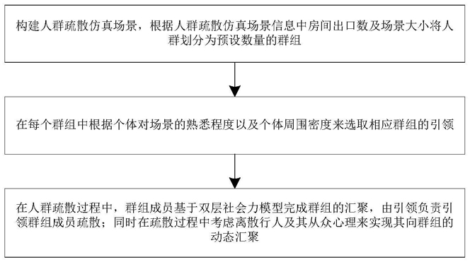 2.如权利要求1所述的一种考虑从众心理的人群疏散仿真方法,其特征在于,该方法还包括:在引领出门后采用临时引领选取方案直至群组内个体均疏散至安全位置。3.如权利要求2所述的考虑从众心理的人群疏散仿真方法,其特征在于,采用临时引领选取方案直至群组内个体均疏散至安全位置的具体过程为:当原始引领不在当前人群疏散场景的原始房间内,则选取距离门口最近的成员作为滞留在原始房间的群组的临时引领指导疏散;已经成功疏散出原始房间的群组成员仍旧跟随原始引领,直至所有的群组成员完成疏散。4.如权利要求1所述的考虑从众心理的人群疏散仿真方法,其特征在于,所述双层社会力模型用来描述引领与群组成员之间的关系,群组成员以引领为其目标位置,利用社会力模型本身的聚集特性,实现群组行人的聚集过程。5.一种考虑从众心理的人群疏散仿真系统,其特征在于,该系统包括仿真服务器,所述仿真服务器包括:场景构建及人群分组模块,其用于构建人群疏散仿真场景,根据人群疏散仿真场景信息中房间出口数及场景大小将人群划分为预设数量的群组;引领选取模块,其用于在每个群组中根据个体对场景的熟悉程度以及个体周围密度来选取相应群组的引领;动态汇聚模块,其用于在人群疏散过程中,群组成员基于双层社会力模型完成群组的汇聚,由引领负责引领群组成员疏散;同时在疏散过程中考虑离散行人及其从众心理来实现其向群组的动态汇聚;其中,在所述动态汇聚模块,考虑离散行人及其从众心理来实现其向群组的动态汇聚的过程为:预设离散行人为Pi;离散行人的安全距离Ls;当前时间点群组的运动方向为εγ(τ);离散行人汇聚的目标群组为P;汇聚速度为vi;则:计算离散行人Pi与各个群组的引领之间的距离l及视角偏移角θ;当l<=Ls时,计算离散行人Pi的朝向群组的方向ει(τ);若(|θ|<=5°)&&(ει(τ)=-εγ(τ)),则最终离散行人Pi取距离最近的群组P为其汇聚的目标群组,且最终的汇聚速度为: