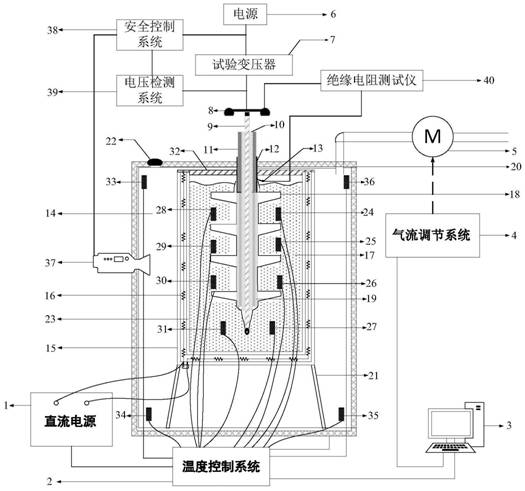 1.一种冷热交替工况下车载电缆终端工频耐压试验系统,用于电缆终端在高温与低温交替的特殊工况下的工频耐压试验,其特征在于,主要由高温加热模拟系统、低温环境模拟系统、气流调节系统、温度控制系统、电源(6)、试验变压器(7)、摄影机(37)、安全控制系统(38)、电压检测系统(39)和绝缘电阻测试仪(40)组成;高温加热模拟系统置于低温环境模拟系统的腔体内;气流调节系统、温度控制系统置于低温环境模拟系统的腔体外,具体构成为:高温加热模拟系统构成为:试验油杯(15)通过支架(21)支撑在低温试验箱(14)内;试验油杯(15)分为外壁和内壁,内壁(23)为绝缘导热层,电阻丝(16)布置在试验油杯(15)杯壁夹层中,具有八只传感器的传感器组分两列依附在试验油杯(15)内壁,在内壁深度方向等距排列;有机玻璃盖(32)封住杯口并预留用于通过被测电缆终端(19)和电气导线的通孔;所述电气导线包括用作试验油杯内的电阻丝(16)和传感器组与外部直流电源(1)、温度控制器(2)连接的电气导线;