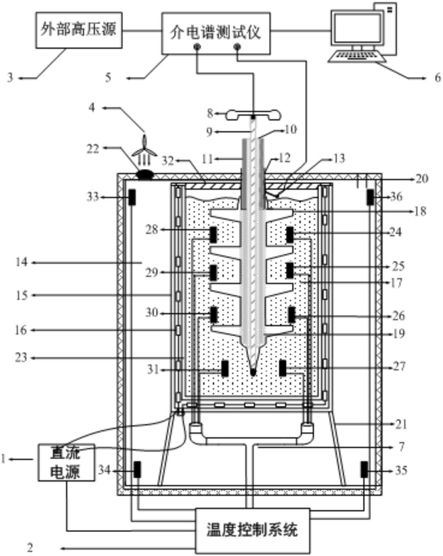 1)电缆终端(19)通过有机玻璃盖(32)进入试验油杯(15),绝缘油(17)完全浸没绝缘伞裙(18),接通低温试验箱(14)、温度控制系统(2)和直流电源(1),对试验油杯(15)进行降温或者升温;