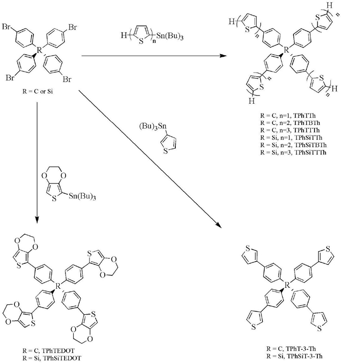 (2)锡化的噻吩类中间体与四-(4-溴苯基)甲烷或硅烷经Suzuki反应生成目标产物;