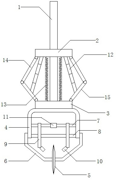 2.根据权利要求1所述的一种用于大理石的切割刀头,其特征在于:所述缓冲件包括缓冲连接杆、液压杆(12)以及钢制弹簧(13);所述缓冲连接杆包括上缓冲杆(14)与下缓冲杆(15);所述上缓冲杆(14)向外倾斜、并均匀固定于支撑盘(2)的底部;所述下缓冲杆(15)的两端分别转动连接于上缓冲杆(14)的底端以及从动盘(3)的边缘;所述液压杆(12)的一端安装于支撑盘(2)的底部,另一端与下缓冲杆(15)的中部转动连接;所述钢制弹簧(13)的两端分别与支撑盘(2)的底部以及从动盘(3)的顶部相连。