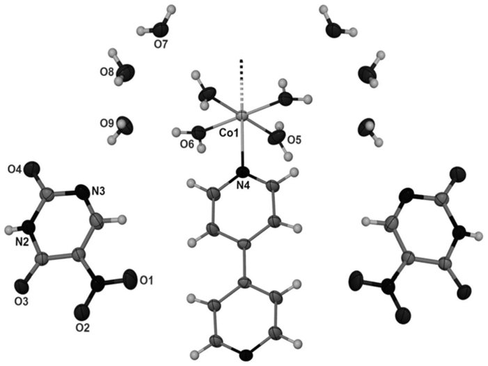 1.一种钴硝基尿嘧啶超分子化合物,其特征在于,该超分子化合物具有一定空间结构,其结构单元为[Co(bpy)(H2O)4]·2(C4H2N3O4)·6H2O,其中bpy=4,4’-二联吡啶,化学式为CoC18H32N8O18,晶系为三斜晶系,空间群为P-1,晶胞参数为α=86.746°,β=79.405°,γ=74.842°,钴离子为六配位的八面体几何构型;所述硝基尿嘧啶为5-硝基尿嘧啶。