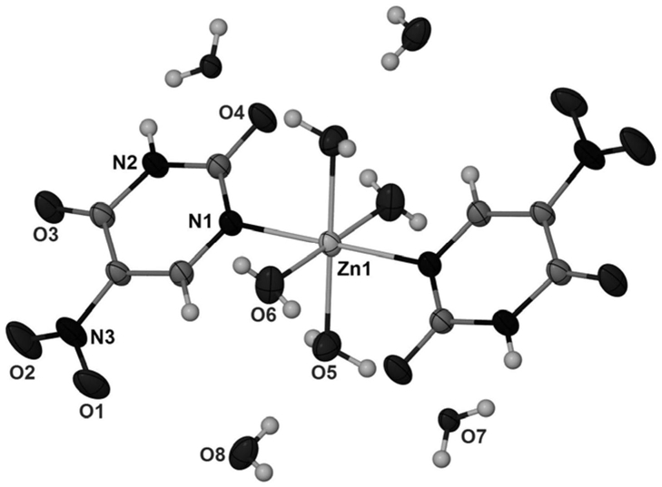 95.707°,β=105.740°,γ=98.306°,锌离子为六配位的八面体几何构型,其中两个氮原子来自于配体5-硝基尿嘧啶,四个氧原子来自四个配位水分子;