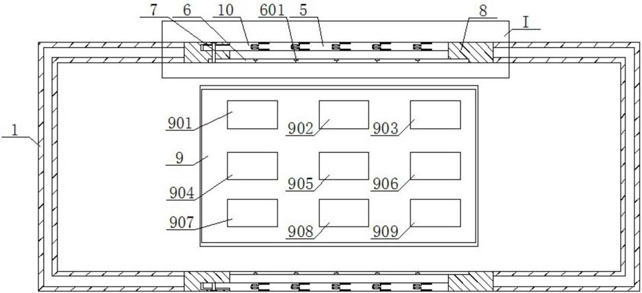 6.根据权利要求1所述的一种采用轻薄化设计的车载导航仪主机,其特征在于:所述PCB板(9)表面设有射频前端(901)、A/D转换器(902)、GPS基带芯片(903)、ARM处理器(904)、数据接口(905)、按键接收端(906)、储存器(907)、调试接口(908)和单片机(909);所述射频前端(901)通过所述A/D转换器(902)连接所述GPS基带芯片(903),且所述数据接口(905)、储存器(907)和调试接口(908)分别通过ARM处理器(904)分别连接所述GPS基带芯片(903),所述数据接口(905)连接所述按键接收端(906),所述按键接收端(906)的输入端位于导航仪表面。