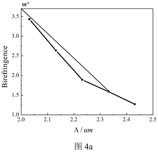 1.一种新型等孔径纯圆孔高双折射光子晶体光纤,所述光纤的横截面包括包层与纤芯(1),所述纤芯(1)设置在中心位置,包层呈扩散状包围在纤芯(1)周围,所述包层包括空气孔(3)和背景材料(2),所述光纤轴向有规律地排列着许多空气孔(3),所述的空气孔(3)沿光纤轴线平行排列,所述光纤的横截面上的空气孔(3)在光纤背景材料(2)中呈周期性排列,其特征在于,所述空气孔(3)的上相邻排位置及下相邻排位置均不设置空气孔(3),间隔排的空气孔相互对准,所述包层折射率低于纤芯(1)折射率,每相邻的四个空气孔(3)构成菱形,所述纤芯(1)区域设置有两排共6个空气孔(3),且两两间距一致,纤芯空气孔直径与包层中的空气孔直径一致;
