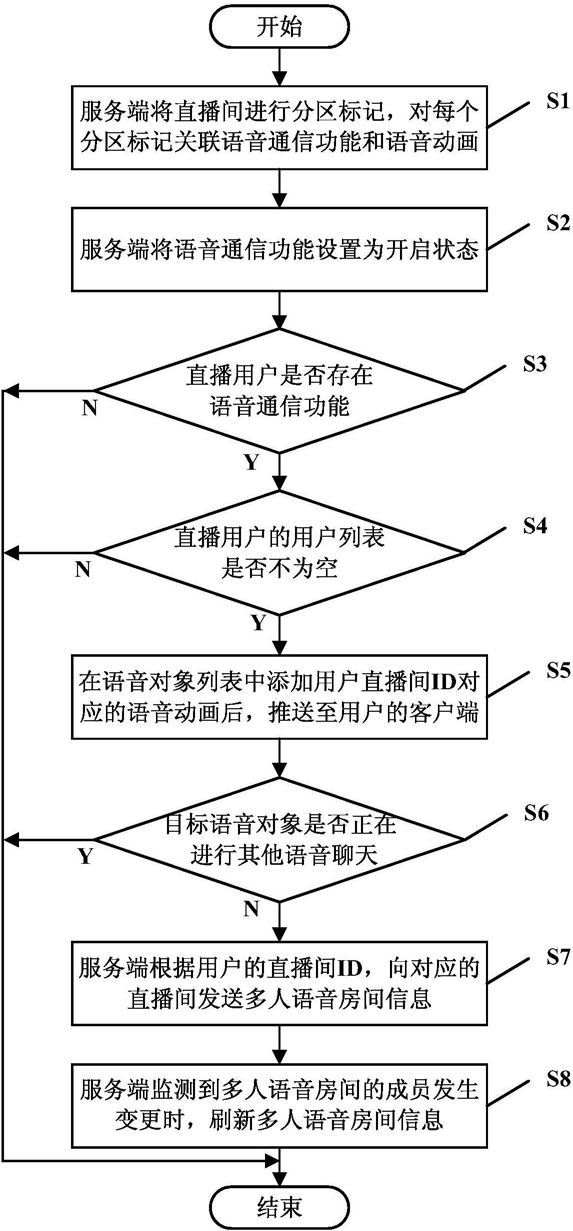 S1:服务端将所有直播间进行分区标记,相同类别的直播间的分区标记相同,对每个分区标记关联语音通信功能和语音动画,转到S2;