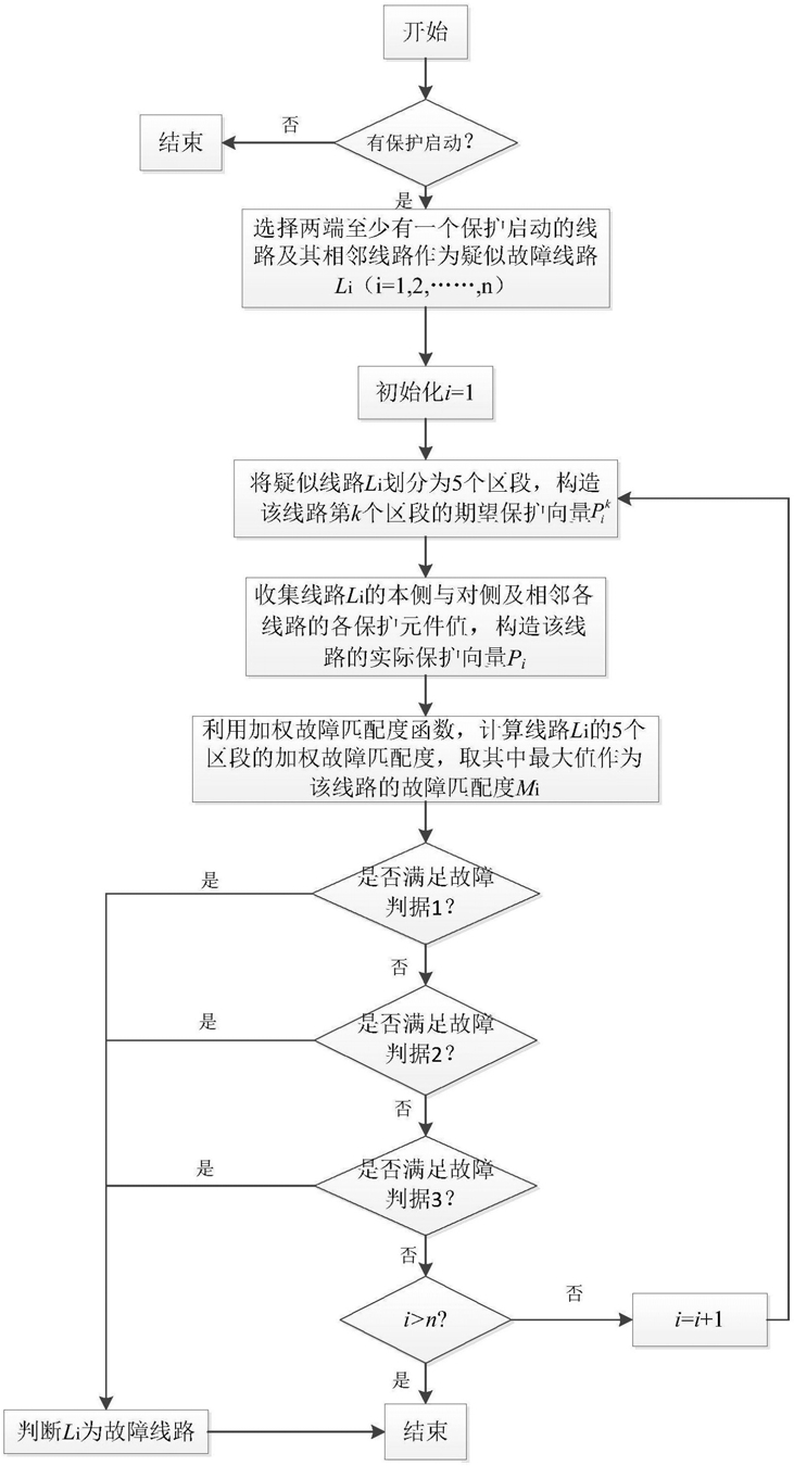再定义了疑似故障线路Li的故障匹配度,即取线路Li的实际保护向量Pi与m个区段的期望保护向量之间的各区段加权故障匹配度中最大值,作为线路Li的故障匹配度Mi,计算方法如下:根据上式,从线路Li的m个区段加权故障匹配度中,获得线路Li的故障匹配度Mi。