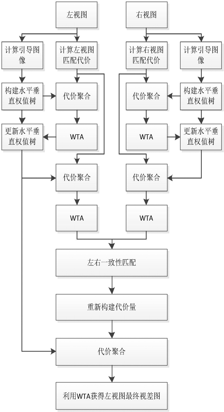 (9)视差优化:首先采用左右一致性检测方法检测步骤(8)获得的视差图D1,将满足左右一致性像素点归类为可靠像素点,不满足的归类为不可靠像素点,对像素点代价量根据下式做更新,获得新的代价量,其中dp为像素点p的视差值,β∈[0,1],根据步骤(8)获得的视差图D1与像素之间的颜色信息依据步骤(6)重新计算相邻像素之间的权值,通过步骤(7)水平树权值传播与代价正则化对新获得的代价量Cnew进行聚合,然后采用胜者为王算法获得最终的视差图。