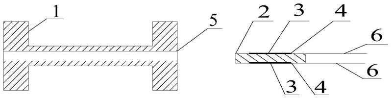 1.一种光纤光栅横向受力应变传感器,其特征在于:它包括由工字型传感器外壳(1)、圆轴基体(2)、光栅(3)、胶粘剂(4)、传感器中空孔(5)和光纤(6)构成的工字型传感器;所述的工字型传感器外壳(1)内设有贯通的传感器中空孔(5),圆轴基体(2)设置在传感器中空孔(5)的中央位置,在圆轴基体(2)的表面上对称布置两条光纤光栅(3),两条光纤光栅(3)在固定过程中应保证平直均匀、不弯曲,两条光纤光栅(3)分别与两根光纤(6)连接,两根光纤(6)延伸出传感器中空孔(5),所述光纤光栅(3)利用胶粘剂(4)黏贴在圆轴基体(2)表面,圆轴基体(2)利用胶水固定在传感器中空孔(5)中央,传感器中空孔(5)两侧使用胶粘剂(4)封孔,避免传感器中空孔(5)内的圆轴基体(2)从孔内滑出;所述的圆轴基体(2)上粘结有可同时测量工程结构表面一点数据的多根光纤光栅。