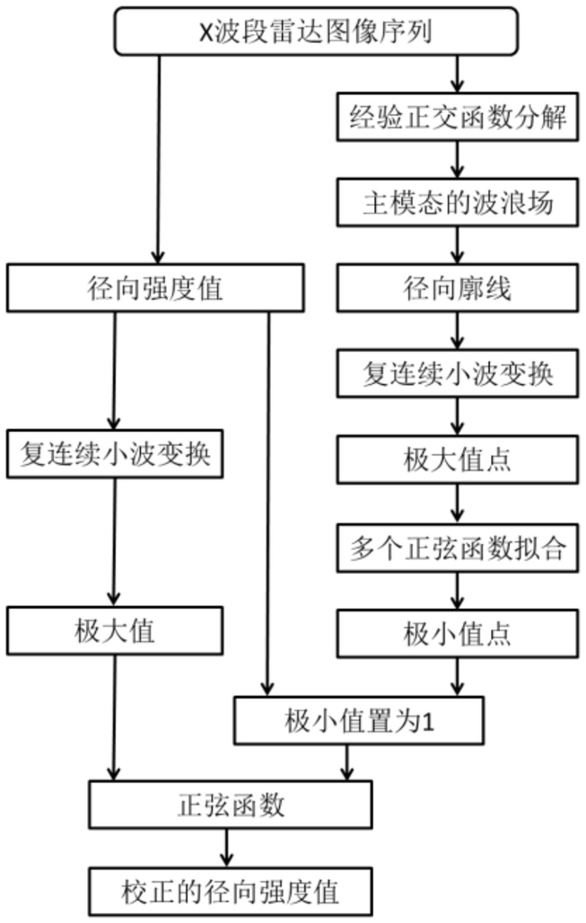 1.一种消除降雨对X波段雷达观测海浪的影响的方法,其特征在于:包括以下步骤:步骤1:选取受降雨影响的X波段雷达图像序列的强度值I(r,θ,t),对该雷达图像序列的强度值作经验正交函数分解,利用第一主模态重构波浪场Ir(r,θ),其中,r为图像中的点到雷达的距离,θ是方位角,t为采集数据的时间;