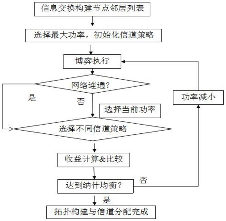 设在网络进行更新时,有且仅有一个节点能更新其发射功率以及节点的信道策略,即在某节点更新策略时,网络中其它节点的功率以及信道状态保持不变;为所有网络节点初始化信道和功率,每个节点的初始化功率为该节点与邻居节点通信的最大功率,当开始进行博弈更新策略时,该节点先降低一个功率等级,然后判断此时整个网络的连通性;如果网络不连通,则该节点在使用该功率等级时无法保证网络的基本连通性能,那么返回上一个功率等级,保持该节点当前的状态不变;如果网络仍然连通,则分别计算在该功率等级下该节点选择不同的可用信道对效益函数的影响,选择这些效益值中的最大值所对应的信道策略作为此时该节点对应的最佳信道选择,当该节点所有功率等级对应的效益计算完成,选取效益最大时对应的功率值即为该节点的最佳功率;依此对每个节点重复进行博弈,直到网络中所有节点的状态均不再改变为止即达到一种纳什均衡状态,博弈结束。
