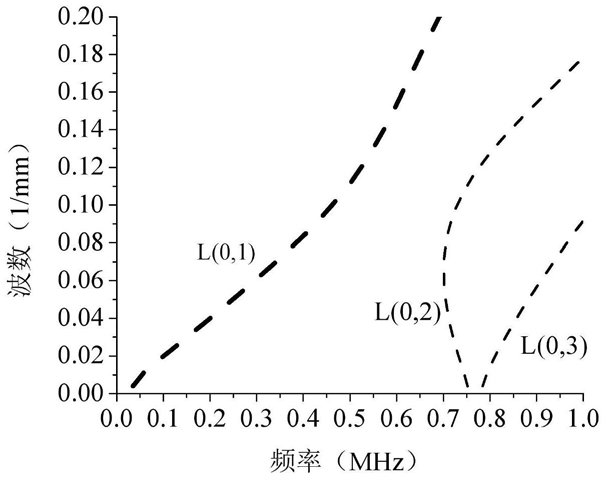 通过提取导波传播路径上一系列节点振动时程组成二维的时间-空间矩阵,通过对单一节点的时程信号进行傅里叶变换,得到每一位置的频率谱;每一位置的谱信息用列矩阵表示,将这些列矩阵组成一个阵列,则给定频率处的元素形成的行向量的空间傅里叶变换给出了波数谱,最终得到频率-波数-幅值谱;采用等高线图将三维矩阵投影到频率-波数平面,即得到计算结果的频率-波数图;