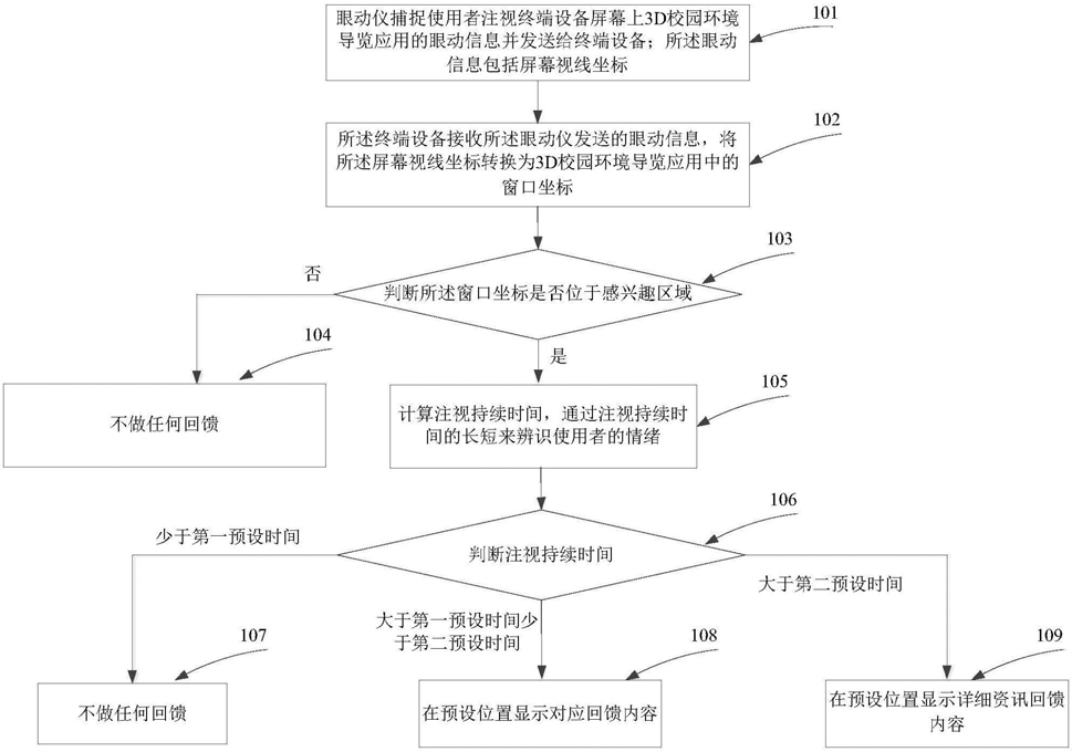 所述终端设备接收所述眼动仪发送的眼动信息,将所述屏幕视线坐标转换为3D校园环境导览应用中的窗口坐标,判断所述窗口坐标是否位于感兴趣区域,如果是,计算注视持续时间,通过注视持续时间的长短来辨识使用者的情绪;如果注视持续时间少于第一预设时间,表示使用者的视线只是扫过或忽略,3D校园环境导览应用不做任何回馈;如果注视持续时间大于第一预设时间少于第二预设时间,表示使用者的注意力集中,3D校园环境导览应用在预设位置显示对应回馈内容;如果注视持续时间大于第二预设时间,表示使用者感兴趣,3D校园环境导览应用在预设位置显示详细资讯回馈内容;所述对应回馈内容包括操作指令、环境地图和/或资讯简介。