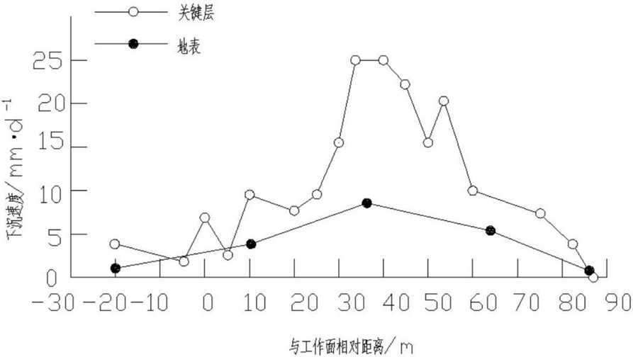 2.根据权利要求1所述的一种新地表下沉动态过程与覆岩离层发展对应关系分析方法,其特征在于:以模型覆岩剖面黏贴测点的测量进行分析,覆岩主关键层在工作面采孔深度为30-40m时,地表下沉速度最快,其下沉速度达到7.5mm/d,由此可见,地表最大下沉速度与关键层最大下沉速度同步,关键层的初次破断导致了地表的快速下沉,计算公式为: