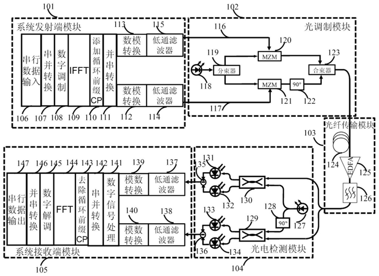 1-1、接收端对接收到的CO-OFDM信号进行相干探测接收,然后进行模数转换,得到电域的信号;